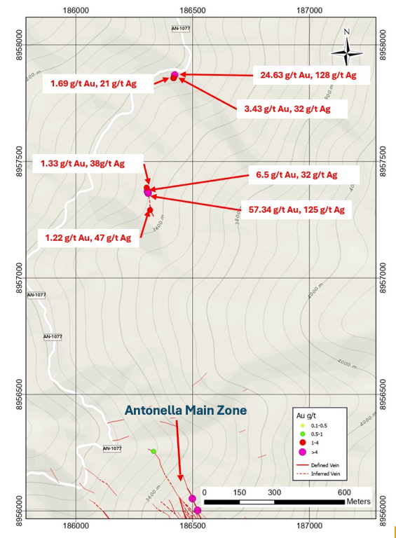 The Antonella concession, covering 900 hectares, is the primary focus of our exploration efforts to-date. This area includes the historic Esperanza mine, which has shown promising mineralized veins.