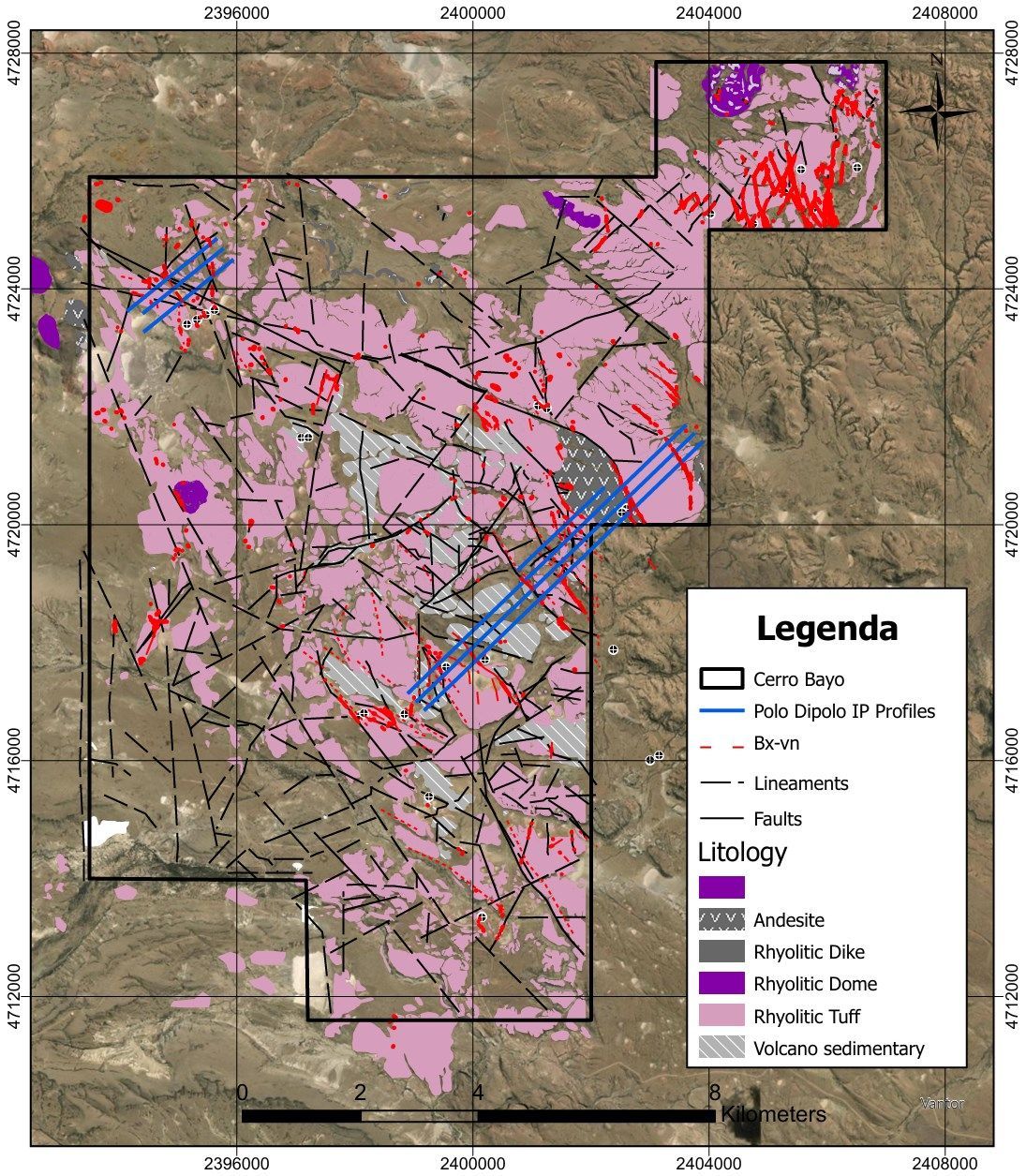 A Pole-Dipole IP profiling program has commenced, consisting of four lines in the southeastern area and three additional, shorter lines in the northwestern area, for a total of approximately 27 line-kilometers. The objective of the program is to complete these transects across the five highest-priority drill target areas before the end of the year. The aim of the profiles is to determine the geometry of the silicified zones previously identified from Gradient Array IP surveying. The silicified zones (silica cap) are anomalous in gold, +/- silver and represent the upper parts of a Low Sulphidation Epithermal (LSE) mineralizing system. The presence of silica cap at Cerro Bayo strongly indicates that the LSE system, with its attendant structurally controlled feeder zone, is preserved. Elsewhere within the Deseado Massif, these feeder zones are host to bonanza grade precious metal deposits, e.g. Newmont's Cerro Nego mine.