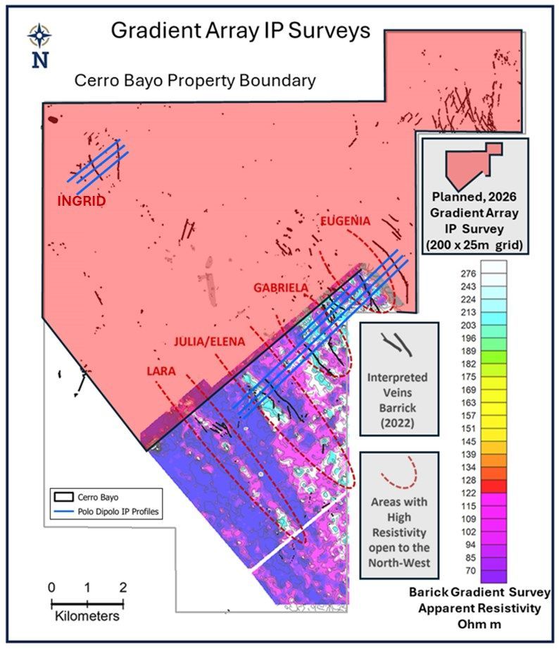 - Initiation of 27 line-kilometer Pole - Dipole Induced Polarization (IP) Profiling of drill target areas within the Cerro Bayo Property